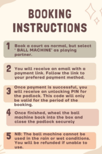 N.B. The ball machine must not be used in wet, or even damp conditions. refunds will be issued if you have it booked and the conditions are wet. Where possible please book court 1 when using the ball machine.